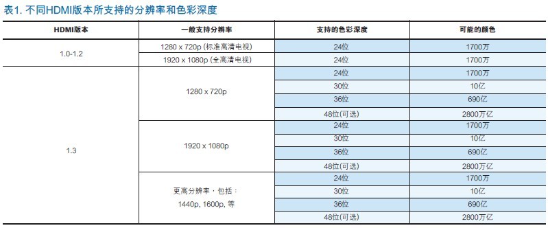 設(shè)計(jì)人員通常也註意到HDMI1.3規(guī)范指定的340MHz TMDS時(shí)鐘速率比數(shù)據(jù)或信號(hào)速率要慢的多。在標(biāo)準(zhǔn)的24位/像素的色彩深度下,通過(guò)TMDS對(duì)傳輸?shù)臄?shù)據(jù)等同於每像素30比特的編碼數(shù)。因此,三個(gè)TMDS通道的每一個(gè)通道都必須在一個(gè)“系統(tǒng)”時(shí)鐘周期內(nèi)傳輸10比特。