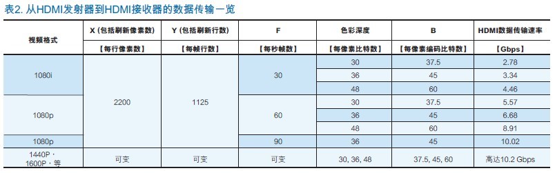 表1顯示了每種分辨率和相應(yīng)的每行像素和每幀行數(shù)。對(duì)於表1列出的每一個(gè)色深,都有一個(gè)相應(yīng)的為每個(gè)像素顏色而傳輸?shù)木幋a比特?cái)?shù)。需要從HDMI發(fā)射器發(fā)送至HDMI接收器的數(shù)據(jù)量可以被解釋為這些變量之間的關(guān)係,包括更新屏幕所需的幀數(shù)。表2描述了這種關(guān)係: