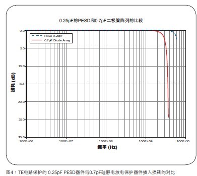 圖4對(duì)TE電路保護(hù)的PESD器件和普通的0.7pF硅靜電放電保護(hù)解決方案進(jìn)行了對(duì)比。TE電路保護(hù)的PESD器件的插入損耗可以忽略不計(jì),即使是在HDMI1.3規(guī)范規(guī)定的最高速度3.4GHz運(yùn)行時(shí)。普通的0.7pF硅靜電放電保護(hù)器件通常表現(xiàn)出其插入損耗隨頻率增加急劇增加的特點(diǎn),當(dāng)HDMI以1080p 36位色彩深度的2.25GHz速度運(yùn)行時(shí),給TMDS信號(hào)引入的插入損耗超過(guò)3dB。以更高的分辨率和顏色深度的3.4GHz全速運(yùn)行時(shí),硅靜電放電保護(hù)器件可以造成超過(guò)6dB的信號(hào)衰減,有效地消減了一半以上的信號(hào)電平。