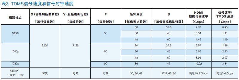 為了說(shuō)明鏈路數(shù)據(jù)速率和物理TMDS對(duì)之間的關(guān)係,表3結(jié)合了表2中的信息與TMDS對(duì)信號(hào)速度,以及相應(yīng)的信號(hào)時(shí)鐘速度。