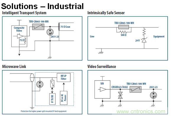 工業(yè)應(yīng)用包含單線或雙線的保護(hù),同樣非常簡(jiǎn)單,TBU加一個(gè)氣體管,再加一個(gè)非常小的TBS。在這里加上TBU管有什么好處呢?因?yàn)門BS反應(yīng)速度非??欤梢院芸旆磻?yīng),TBU很快就會(huì)打通,在打通之后,打開(kāi)之后所有的線路的過(guò)流和高壓都會(huì)阻絕在外面。