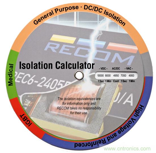 In certain data sheets, the isolation voltage is specified for 1 second. In others, it is specified for 1 minute or even as a continuous value. The longer the load time is, the lower the permissible voltage will be. To enable users to determine this crucial value accurately, RECOM provides a free ISO Calculator tool. The CD-sized disk contains the relevant reference values for the isolation specifications. The ISO Calculator can be ordered free of charge by writing to info@recom-electronic.com. Alternatively, it is available as an online tool at www.recom-electronic.com.