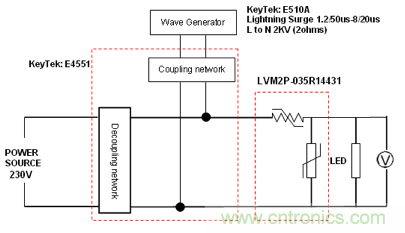 2Pro AC 器件一個常見的應(yīng)用是 LED 照明,其雷擊的保護要求都小于 2kV surge,2Pro AC 正好可以防護 2kV 的雷擊。下圖是不久前網(wǎng)友調(diào)試的一塊客戶 LED 電路板示意圖,雷擊要求是 2kV,把 2Pro AC 放置于 LED lighting 電路輸入端,再加上雷擊波形發(fā)生器和交流耦合。