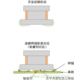 在 生產(chǎn)第一代LQN5N及第二代LQH32M時,雖會對部分混合IC基板進(jìn)行回流焊接,但一般是對裝有插腳零部件的基板背面進(jìn)行波峰焊接。其貼裝方法是將膠 粘劑涂在基板焊盤的中央部或貼片元件電極的中央部,待其固化后將其投入波峰焊接槽。與CR貼片元件相比,體積較大的LQH系列在受到焊錫流動阻力后易發(fā)生 脫落,因此在電極間中央部位設(shè)計了突起(稱為梯級磁芯)?,F(xiàn)在看來的話,是反向支架形狀。至今再也見不到這種結(jié)構(gòu)。
