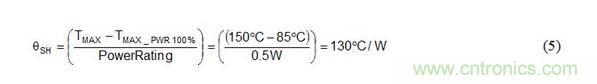 另外,電阻器也不可能在 100% 額定耗散 (TMAX_PWR100%)、85°C 下工作。您可通過(guò)該溫度、最大工作溫度以及電阻器的功率額定值計(jì)算出針對(duì) θSH 的值,如圖 5 所示。
