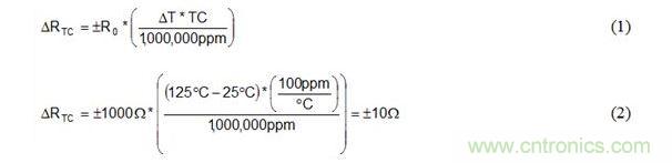 公式 1 和 公式 2 是溫度從 25°C 到 125°C 變化時(shí),如何使用電阻器 TC 規(guī)范計(jì)算 1kΩ、±100ppm/°C 電阻器阻值 ΔRTC 變化的實(shí)例。