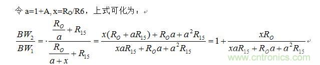 從上式看出,當(dāng)A較小時,R6的加入確實有擴(kuò)展帶寬的作用,但R6的取值不能太大。當(dāng)R6取得很大時,x=R0/R6趨近于0,BW2/BW1趨近于1,也就不能擴(kuò)展帶寬了。