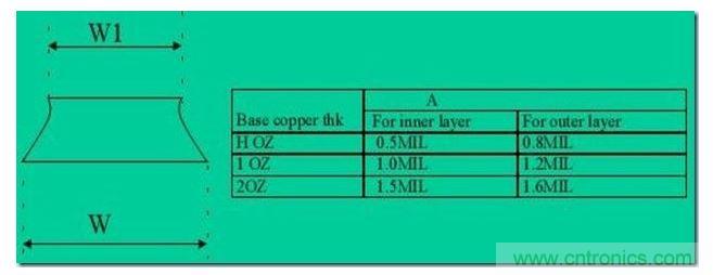 絕緣層的介電常數(shù)Er、走線寬度W1、W2(梯形)、走線厚度T和絕緣層厚度H。