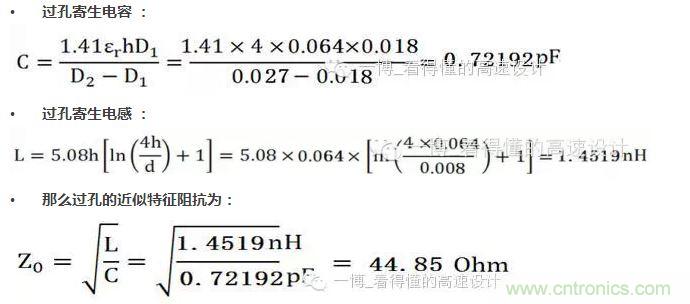 此公式是將過(guò)孔等效為傳輸線(xiàn)的模型來(lái)計(jì)算的,如果常規(guī)我們單端信號(hào)是50歐姆的特征阻抗,過(guò)孔的阻抗如上計(jì)算約為45歐姆,拉低了整體的特征阻抗,所以說(shuō)呈現(xiàn)容性效應(yīng)。