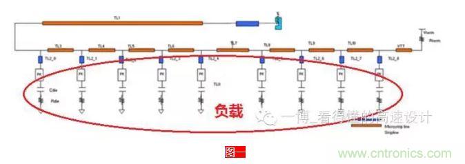 容性負(fù)載?是負(fù)載呈容性,還是帶容性的負(fù)載?呵呵,這不一個(gè)意思嘛,中國(guó)的語(yǔ)言,難怪老外覺(jué)得很難搞懂,自己人都被繞暈了。負(fù)載怎么會(huì)呈容性呢?這個(gè)主要是在多負(fù)載的情況下,如下圖一所示,由于分支和負(fù)載較多,不可避免的會(huì)增加過(guò)孔來(lái)連通信號(hào),普通過(guò)孔是呈容性的,其次還有芯片封裝上的寄生電容(約0.33~0.44pF),另外還有Die上的寄生電容(約0.77~2.12pF),所有的這些電容會(huì)降低信號(hào)線(xiàn)的有效特征阻抗。