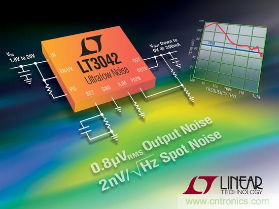【導讀】近日,凌力爾特公司推出領(lǐng)先的具備超低噪聲、超高電源紋波抑制的低壓差電壓線性調(diào)節(jié)器 LT3042。該器件的優(yōu)勢在于具有僅為 2nV/√Hz (在 10kHz) 的超低點噪聲和 0.8µVRMS 的積分輸出噪聲 (在 10Hz 至 100kHz 的寬帶寬內(nèi))。該器件低頻和高頻 PSRR 性能使其占有巨大的優(yōu)勢。低頻 PSRR 超過 90dB (直到 10kHz),而高頻 PSRR 則超過 75dB (直到 3MHz),可使噪聲或高紋波輸入電源變得 “安靜”。