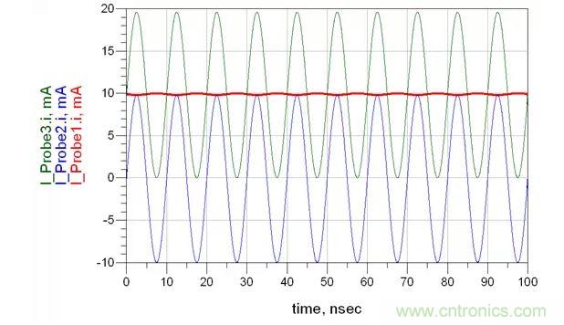 環(huán)路2由一個100MHz的AC1.0V供電,表示我們的干擾源,電流表2測量路徑2上的電流。