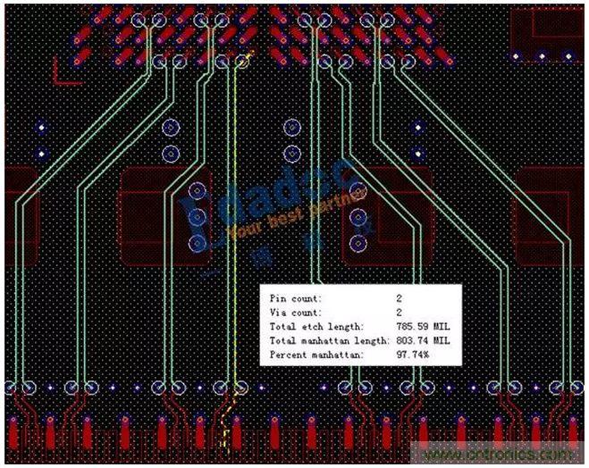 連接器采用的是CFP2的表貼連接器,由于PHY芯片到光口連接器距離很短,所以當(dāng)初設(shè)計(jì)的時(shí)候就直接從芯片打孔連線過來,沒有經(jīng)過任何特殊的處理,最后板上走線總長度約800mil,如下圖一所示。
