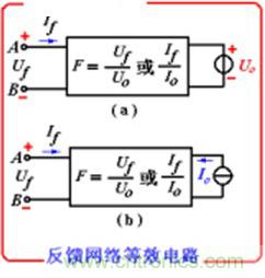 繪反饋網(wǎng)絡(luò)的輸入回路時(shí),對(duì)電壓反饋,其輸入用恒壓源Uo代替基本放大電路;對(duì)電流反饋,用恒流源Io代替基本放大電路,如下圖所示。