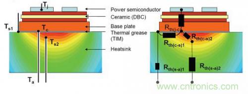 其中Tc為芯片的外殼溫度,PD為芯片在該環(huán)境中的耗散功率,Tj表示芯片的結(jié)點(diǎn)溫度,目前大多數(shù)芯片的結(jié)點(diǎn)溫度為150℃,Rjc表示芯片內(nèi)部至外殼的熱阻,Rcs表示外殼至散熱片的熱阻,Rsa表示散熱片到空氣的熱阻,一般功率器件用Rjc進(jìn)行計(jì)算即可。