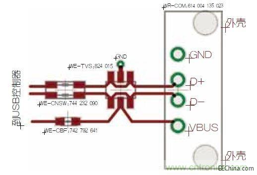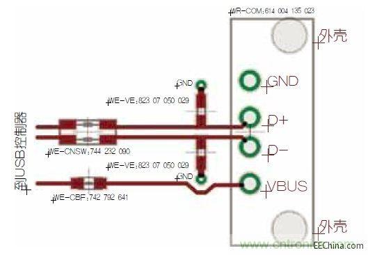 從圖3可以明顯看出,有兩條差分信號線(D+和D-)從插頭連接器連接到TVS二極管,再通過電流補償式數(shù)據(jù)線扼流圈連接到USB控制器。這樣能夠得到出色的靜電放電保護功能,并能良好的抑制數(shù)據(jù)線對。VBUS通過TVS二極管路由到貼片磁珠。在貼片磁珠之后,可以插入額外的電容和另一個貼片磁珠來實現(xiàn)最大可能的PI濾波器衰減。