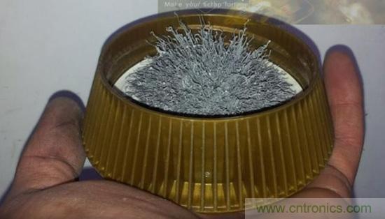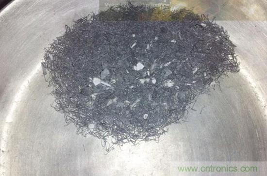 ▼ 重復(fù)幾次上面的步驟,直到把電路芯片灰中的金屬全部分離出來。