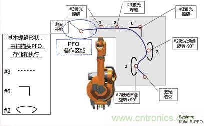 除了激光拼焊,激光飛行焊也已經(jīng)被廣泛應(yīng)用于汽車車身及其他零部件的焊接。激光飛行焊是將振鏡焊接頭與機(jī)器人的運(yùn)動(dòng)結(jié)合起來,實(shí)現(xiàn)高效靈活的激光焊接。振鏡(PFO)及飛行焊的原理見圖4、5、6。其中PFO可以通過兩片鏡片的旋轉(zhuǎn),實(shí)現(xiàn)激光焦點(diǎn)在工件上的快速靈活移動(dòng)和定位,可以大大提供激光焊接時(shí)的動(dòng)態(tài)性能,更加高效。而機(jī)器人則可以擴(kuò)展焊接范圍,以實(shí)現(xiàn)更大零件的焊接。兩者的結(jié)合,則可以實(shí)現(xiàn)優(yōu)勢(shì)互補(bǔ),達(dá)到高效、靈活、低成本的激光焊接。