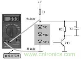 檢測這一電路中的3只二極管最為有效的方法是測量二極管上的直流電壓,如圖所示是測量時(shí)接線示意圖。如果測量直流電壓結(jié)果是1.8V左右,說明3只二極管工作正常;如果測量直流電壓結(jié)果是0V,要測量直流工作電壓+V是否正常和電阻R1是否開路,與3只二極管無關(guān),因?yàn)?只二極管同時(shí)擊穿的可能性較?。蝗绻麥y量直流電壓結(jié)果大于1.8V,檢查3只二極管中有一只開路故障。