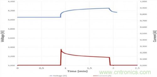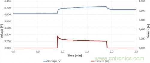 圖6a.6小時后的首個維護充電脈沖(1分鐘)(90 F 4.2 V系統(tǒng)示例)