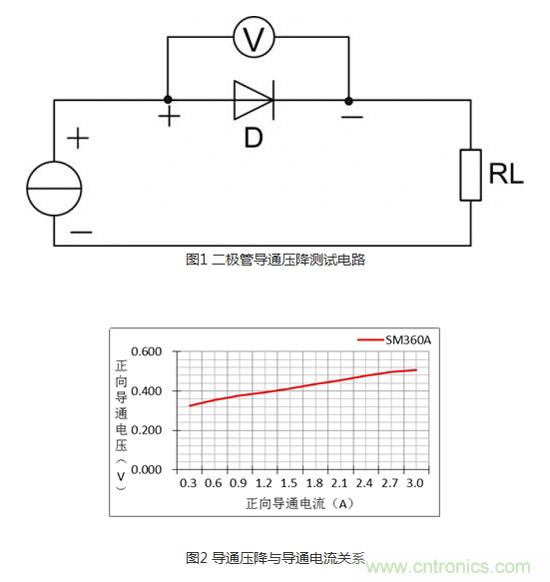 在二極管兩端加正向偏置電壓時,其內(nèi)部電場區(qū)域變窄,可以有較大的正向擴散電流通過PN結(jié)。只有當正向電壓達到某一數(shù)值(這一數(shù)值稱為“門檻電壓”,鍺管約為0.2V,硅管約為0.6V)以后,二極管才能真正導通。但二極管的導通壓降是恒定不變的嗎?它與正向擴散電流又存在什么樣的關(guān)系?通過下圖1的測試電路在常溫下對型號為SM360A的二極管進行導通電流與導通壓降的關(guān)系測試,可得到如圖2所示的曲線關(guān)系:正向?qū)▔航蹬c導通電流成正比,其浮動壓差為0.2V。從輕載導通電流到額定導通電流的壓差雖僅為0.2V,但對于功率二極管來說它不僅影響效率也影響二極管的溫升,所以在價格條件允許下,盡量選擇導通壓降小、額定工作電流較實際電流高一倍的二極管。
