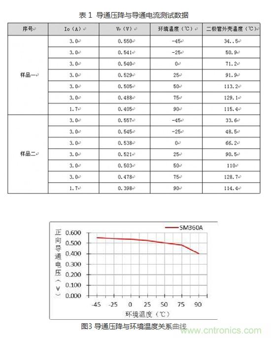 在我們開發(fā)產(chǎn)品的過程中,高低溫環(huán)境對電子元器件的影響才是產(chǎn)品穩(wěn)定工作的最大障礙。環(huán)境溫度對絕大部分電子元器件的影響無疑是巨大的,二極管當然也不例外,在高低溫環(huán)境下通過對SM360A的實測數(shù)據(jù)表1與圖3的關(guān)系曲線可知道:二極管的導通壓降與環(huán)境溫度成反比。在環(huán)境溫度為-45℃時雖導通壓降最大,卻不影響二極管的穩(wěn)定性,但在環(huán)境溫度為75℃時,外殼溫度卻已超過了數(shù)據(jù)手冊給出的125℃,則該二極管在75℃時就必須降額使用。這也是為什么開關(guān)電源在某一個高溫點需要降額使用的因素之一。