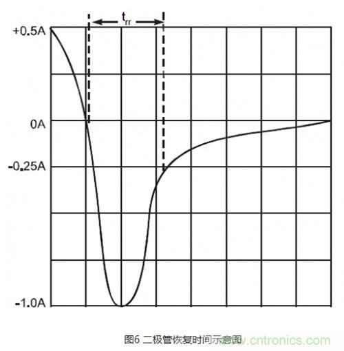 如圖6所示,二極管的反向恢復時間為電流通過零點由正向轉(zhuǎn)換成反向,再由反向轉(zhuǎn)換到規(guī)定低值的時間間隔,實際上是釋放二極管在正向?qū)ㄆ陂g向PN結(jié)的擴散電容中儲存的電荷。反向恢復時間決定了二極管能在多高頻率的連續(xù)脈沖下做開關(guān)使用,如果反向脈沖的持續(xù)時間比反向恢復時間短,則二極管在正向、反向均可導通就起不到開關(guān)的作用。PN結(jié)中儲存的電荷量與反向電壓共同決定了反向恢復時間,而在高頻脈沖下不但會使其損耗加重,也會引起較大的電磁干擾。所以知道二極管的反向恢復時間正確選擇二極管和合理設(shè)計電路是必要的,選擇二極管時應盡量選擇PN結(jié)電容小、反向恢復時間短的,但大多數(shù)廠家都不提供該參數(shù)數(shù)據(jù)。