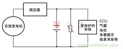 現(xiàn)代汽車設(shè)計中,所有車載電子設(shè)備都要連接電池和交流發(fā)電機。交流發(fā)電機是電氣瞬態(tài)的主要來源,其中最 糟的是拋負載。這種情況發(fā)生在電池已經(jīng)斷開而交流發(fā)電機正在發(fā)電、其他負載還在交流發(fā)電機環(huán)路上時。如果置之不理,電氣尖峰和瞬態(tài)將沿著電線傳遞,導(dǎo)致個別電子設(shè)備和傳感器故障,或永久損壞汽車的電子系統(tǒng)。當(dāng)然,拋負載失控還會威脅車輛本身的安全性和可靠性。