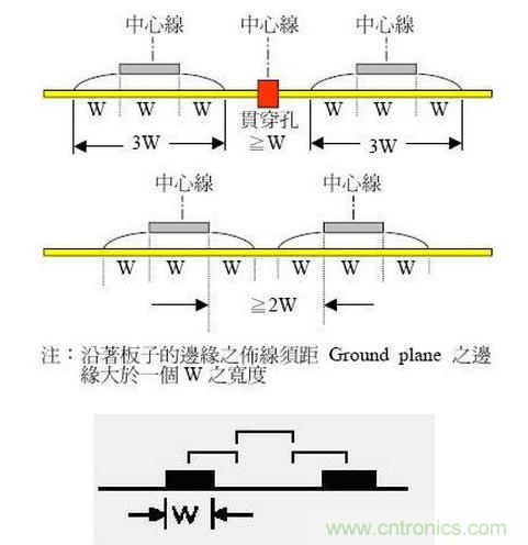 在抑制電路板走線信號串?dāng)_方面,有一個非常有名的3W布線規(guī)則(其中W就是布線寬度),它的內(nèi)容是:對于寬度是3W的信號線,如果其他走線的中心和它的中心之間的距離大于3W,就能避免信號之間的串?dāng)_。如下圖所示。