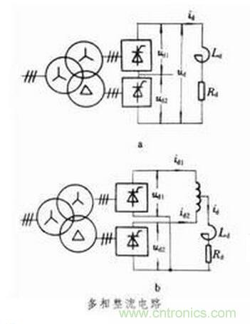 隨著整流電路的功率進一步增大(如軋鋼電動機,功率達數(shù)兆瓦),為了減輕對電網(wǎng)的干擾,特別是減輕整流電路高次諧波對電網(wǎng)的影響,可采用十二相、十八相、二十四相,乃至三十六相的多相整流電路。圖3a為兩組三相橋串聯(lián)組成的十二相整流電路。為了獲得十二相波形,每個波頭應(yīng)該錯開30°。所以采用三繞組變壓器,次級的兩個繞組一個接成星形,另一個接成三角形,分別供給兩組三相橋。兩組整流橋串聯(lián)后再接到負載。由于兩組整流橋輸出的電壓的相位彼此差30°,因此在負載上得到十二脈波的整流電壓,合成電壓中最低次諧波頻率為600Hz,輸出電壓ud=ud1+ud2,電流id=id1=id2。圖3b是兩組三相橋并聯(lián)組成大電流的十二相整流電路。兩橋變壓器次級繞組電壓依次相差30°。若兩組橋的交流線電壓相等,各自的控制角也相等,則兩組橋的整流平均電壓也相等,只要極性相符合,就可以并聯(lián)運行。但是兩組整流電壓的瞬時值是不等的,兩組電源間會出現(xiàn)交流環(huán)流。為了限止環(huán)流,延長晶閘管的導(dǎo)通時間,需要加入平衡電抗器,輸出電壓ud=(ud1+ud2)/2,電流id=id1+id2。