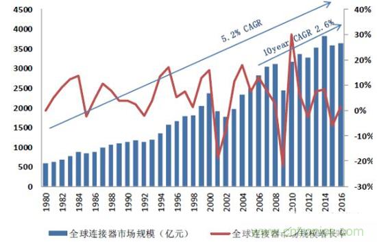 這是因為全球連接器市場已經(jīng)連續(xù)近40年來持續(xù)增長,據(jù)Bishop&Associate數(shù)據(jù),全球連接器市場從1980年的594億元增長到2016年的3643億元,復合增長率高達5.2%,近十年來增速放緩,復合增長率為2.6%。從年度來看2016 年全球連接器市場達到 544 億美元,同比增長 4.5%,依然保持穩(wěn)健成長的態(tài)勢。中國市場表現(xiàn)更優(yōu),增速約為全球市場增速 2 倍,同比增長10%,達到159.4億美元,占全球比例接近30%,遠高2010年的 20%。雖然全球連接器市場2014年之后出現(xiàn)暫時性下滑,但隨著中國經(jīng)濟觸底反彈以及智能化升級,必將繼續(xù)帶動這一產(chǎn)業(yè)向前快速發(fā)展。