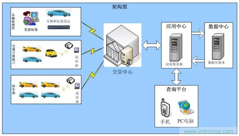 正是由于電子車(chē)牌相比傳統(tǒng)車(chē)牌有這么多的優(yōu)勢(shì)和特點(diǎn),可以預(yù)見(jiàn)在不久的將來(lái),機(jī)動(dòng)車(chē)輛將會(huì)逐步使用帶有電子標(biāo)簽的電子車(chē)牌替代目前的傳統(tǒng)車(chē)牌,這樣一來(lái),從車(chē)輛前端的電子車(chē)牌,到后端的車(chē)牌識(shí)別、數(shù)據(jù)傳輸、車(chē)輛管理、數(shù)據(jù)存儲(chǔ)、終端查詢(xún)等整個(gè)平臺(tái)的構(gòu)建和發(fā)展前景都是十分廣闊的,圖2是整個(gè)平臺(tái)組成架構(gòu)的示意圖。