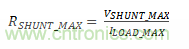 計(jì)算最大分流電阻。當(dāng)來自負(fù)載(ILOAD)的電流流過分流電阻器(RSHUNT)時(shí),分流電阻器上會(huì)形成一個(gè)電壓電位(VSHUNT)。VSHUNT被視為系統(tǒng)負(fù)載的“接地端”。因此,建議將VSHUN的最大負(fù)載電流保持在100mV以下,以避免在與其它具有真正0V接地的系統(tǒng)連接時(shí)出現(xiàn)問題。公式2用于計(jì)算RSHUNT值: