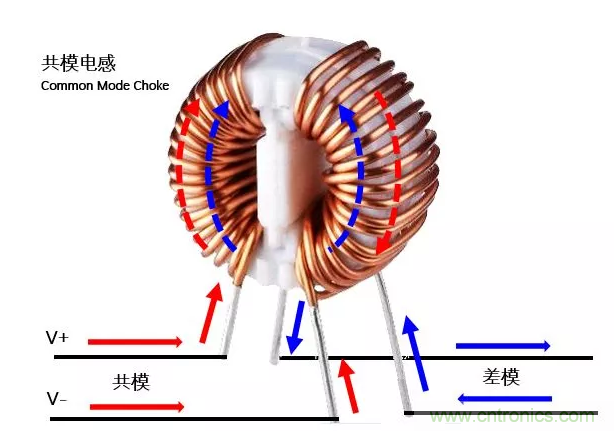 換一個(gè)方式理解:當(dāng)V+上流過(guò)一個(gè)頻率的共模干擾,形成的交變磁場(chǎng),會(huì)在另一個(gè)線圈上形成一個(gè)感應(yīng)電流,根據(jù)左手定則,感應(yīng)電流的方向與V-上共模干擾的方向相反,就抵消了一部分,減小了共模干擾。