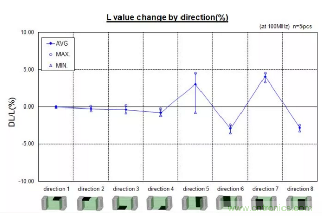 可以看出,標(biāo)記點(diǎn)朝側(cè)面,感值變化較大,所以貼片時(shí)應(yīng)注意讓電感上的標(biāo)記點(diǎn)朝上。