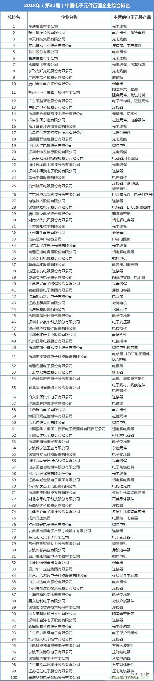 圖1:2018年(第31屆)中國電子元件百強企業(yè)綜合排名