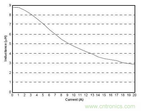 實際上,轉換電路中的開關功率電感總會有一個“軟”飽和度。要了解這個概念可以觀察實際測量的電感Vs DC電流的曲線: