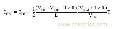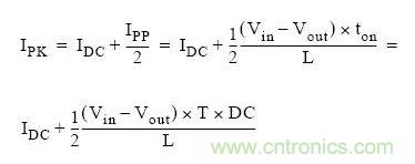 通過上圖我們可以看到,流過電感的最大電流為DC電流加開關峰峰電流的一半。上圖也稱為紋波電流。根據(jù)上述的公式,我們可以計算出峰值電流: