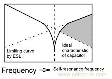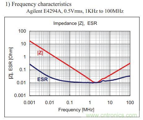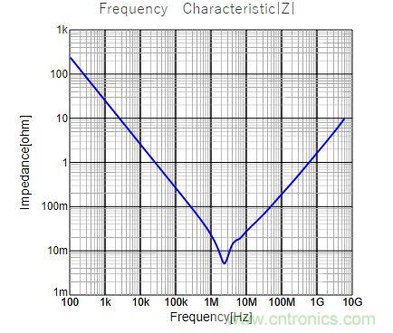 MLCC有經(jīng)典的V型阻抗-頻率曲線(xiàn)。隨著頻率升高,寄生電感的影響開(kāi)始凸顯,阻抗先變小再變大,這是MLCC的固有特性。曲線(xiàn)中的最低點(diǎn)就是MLCC的自諧振頻率。