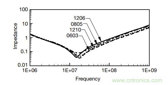 一般來(lái)說(shuō),直插件的引線(xiàn)較長(zhǎng),其寄生電感比SMD大;電解電容內(nèi)部有大量卷繞結(jié)構(gòu)的鋁箔,寄生電感比其它工藝的電容大。1206尺寸的MLCC內(nèi)部電極面積和焊接端子截面明顯比0805大,所以尺寸越大的MLCC,自諧振頻率就越低。