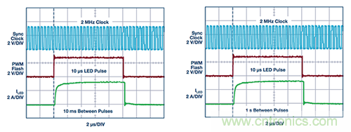 圖2. 無論P(yáng)WM關(guān)斷時(shí)間是多少,圖1所示并聯(lián)LED驅(qū)動(dòng)器的3 A相機(jī)閃光波形看起來相同。波形顯示,(a) 10 ms之后和(b) 1 s之后的10μs脈沖是相同的。經(jīng)過一天或更長(zhǎng)的PWM關(guān)斷時(shí)間之后,LT3932 LED閃光波形看起來也相同。