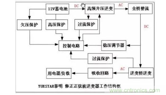 然后我們看一下整個(gè)過程的電路圖:12V直流→高頻升壓→220V直流→全橋整流→220V直流→逆變橋逆變→220V交流
