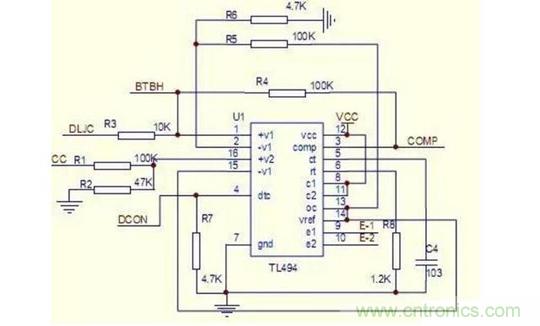 (1)腳第一組放大器的同相輸入端,檢測輸出電流,與3個(gè)0.33R 電阻分壓,當(dāng)電流過大時(shí),分壓電阻上的電壓超過(2)腳基準(zhǔn)電壓,(3)腳放大器輸出端輸出高電平,(3)腳為高電平時(shí),電路進(jìn)入保護(hù)狀態(tài)。(2)腳為比較器的反相輸入端,接(14)腳基準(zhǔn),作比較器的參考電壓,外部輸入端的控制信號可輸入至腳(4)的截止時(shí)間控制端(也叫死區(qū)時(shí)間控制),與腳(1)、(2)、(15)、(16)誤差放大器的輸入端,其輸入端點(diǎn)的抵補(bǔ)電壓為120mV,其可限制輸出截止時(shí)間至最小值,大約為最初鋸齒波周期時(shí)間的4%。當(dāng)13腳的輸出??刂贫私拥貢r(shí),可獲得96%最大工作周期,而當(dāng)(13)腳接制參考電壓時(shí),可獲得48%最大工作周期。如果我們在第4腳截止時(shí)間控制輸入端設(shè)定一個(gè)固定電壓,其范圍由0V至3.3V之間,則附加的截止時(shí)間一定出現(xiàn)在輸出上。 (5)、(6)腳是一個(gè)固定頻率的脈沖寬度調(diào)制電路,內(nèi)置了線性鋸齒波振蕩器,振蕩頻率可通過外部的一個(gè)電阻和一個(gè)電容進(jìn)行調(diào)節(jié),其振蕩頻率如下: