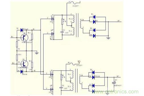 這是一個(gè)推挽式拓?fù)淠孀冸娐?,?dāng)E1驅(qū)動(dòng)脈沖驅(qū)動(dòng)時(shí),Q1導(dǎo)通,使VT3、VT6導(dǎo)通,VT7、VT8截止,此時(shí)電路進(jìn)行正半周波形放大,變壓器升壓到次級,通過高頻整流管整流,當(dāng)E2脈沖驅(qū)動(dòng)時(shí),Q2導(dǎo)通,驅(qū)動(dòng)VT7、VT8導(dǎo)通。VT3、VT6截止,進(jìn)得負(fù)半周波形放大。經(jīng)升壓變壓器升壓后,高頻整流。