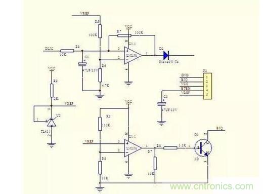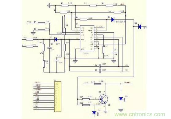 電路中采用雙運(yùn)放比較放大器LM358來控制輸出過流保護(hù),輸出電壓過低保護(hù)電路,TL431在此設(shè)制2.5V基準(zhǔn)電壓,給比較器同相輸入端作參考電壓,第一組運(yùn)放的同相輸入端接輸出電流檢測,反相輸入端接參考電壓,當(dāng)電流過大,比較器輸入電壓升高,當(dāng)超過2.5V時(shí),輸出端輸出高電平,送入IC1的3腳,IC關(guān)閉輸出。第二組運(yùn)放同相輸入端接參考電壓,反相輸入端接輸出電壓,當(dāng)電壓過低,檢測分壓后電壓低于2.5V時(shí),輸出端輸出高電平,Q1導(dǎo)通,蜂鳴器報(bào)警。