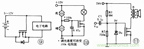 一種簡單的觸摸調(diào)光電路如圖10。當手指觸摸上觸頭時,電容經(jīng)手指電阻及100k充電,VGS漸增大,燈漸亮;當觸摸下觸頭時,電容經(jīng)