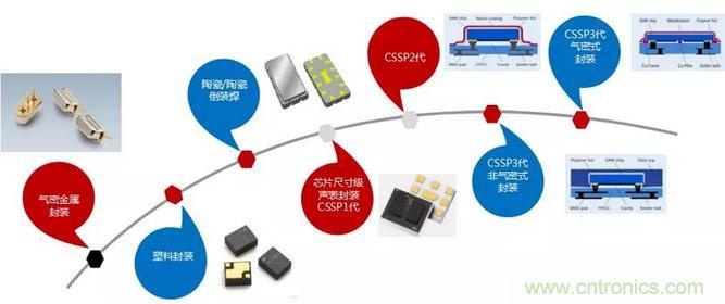 SAW器件封裝要求:(1)器件有源表面必須有一定空間;(2)襯底和封裝材料必須有良好的熱匹配;(3)防止?jié)駳饨撕臀⒘U次?。先后?jīng)歷過氣密金屬封裝、塑料封裝、陶瓷封裝、陶瓷倒裝焊、芯片尺寸級聲表封裝CSSP等幾個階段,針對不同的客戶需求和應用場景這些封裝方案依然共存,但是器件的小型化是大勢所趨。