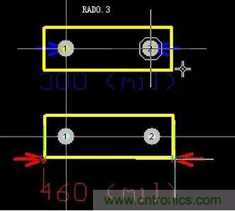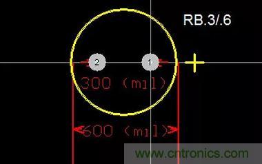 電解電容封裝則以RB標(biāo)識,常見封裝有:RB.2/.4、RB.3/.6、RB.4/.8、RB.5/1.0,符號中前面數(shù)字表示焊盤中心孔間距,后面數(shù)字表示外圍尺寸(絲?。瑔挝蝗匀皇怯⒋?,如下圖(RB-.3/.6):