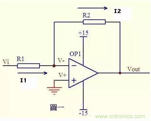 圖一運放的同向端接地=0V,反向端和同向端虛短,所以也是0V,反向輸入端輸入電阻很高,虛斷,幾乎沒有電流注入和流出,那么R1和R2相當于是串聯(lián)的,流過一個串聯(lián)電路中的每一只組件的電流是相同的,即流過R1的電流和流過R2的電流是相同的。 流過R1的電流I1 = (Vi - V-)/R1 ……a 流過R2的電流I2 = (V- - Vout)/R2 ……b V- = V+ = 0 ……c I1 = I2 ……d 求解上面的初中代數(shù)方程得Vout = (-R2/R1)*Vi 這就是傳說中的反向放大器的輸入輸出關系式了。