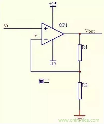 圖二中Vi與V-虛短,則 Vi = V- ……a 因為虛斷,反向輸入端沒有電流輸入輸出,通過R1和R2 的電流相等,設此電流為I,由歐姆定律得: I = Vout/(R1+R2) ……b Vi等于R2上的分壓, 即:Vi = I*R2 ……c 由abc式得Vout=Vi*(R1+R2)/R2 這就是傳說中的同向放大器的公式了。